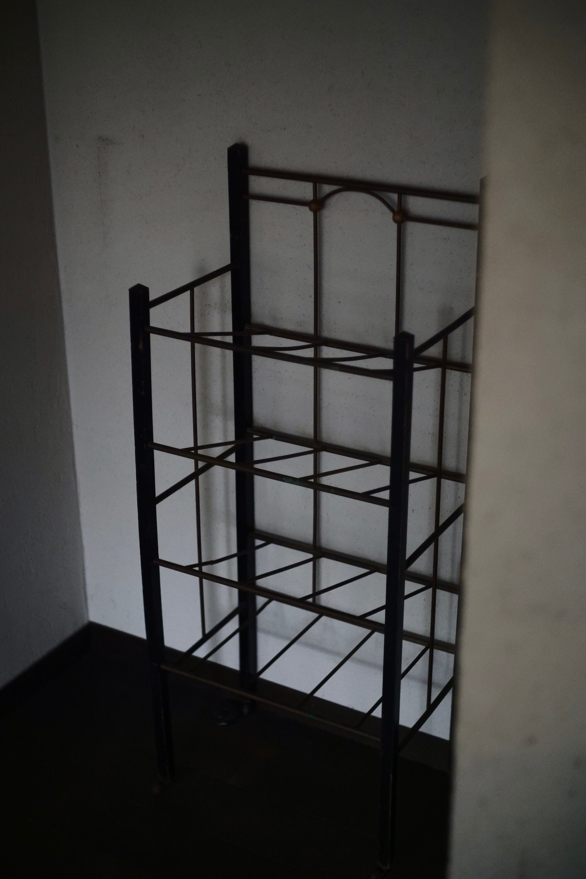 USA買付けの50sヴィンテージラックです。真鍮と木(黒塗装)の組み合わせは軽量で移動もし易く何処にでも馴染む色合いとなっております。一段当たりの高さが165mm〜180mm、奥行きが260mm〜280mmとなり、それぞれバラバラの高さと奥行きですが男性用靴箱が余裕を持って入るサイズ感です。